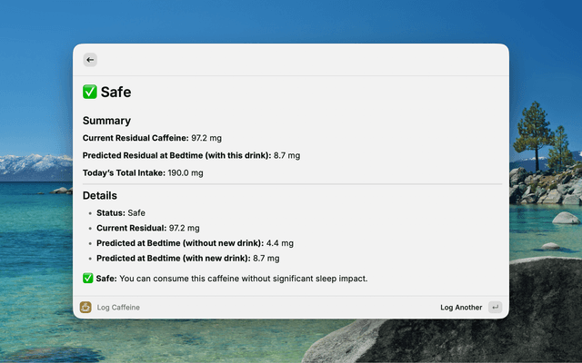• Status Indicators - Safe, Warning, or No More Caffeine based on predicted impact