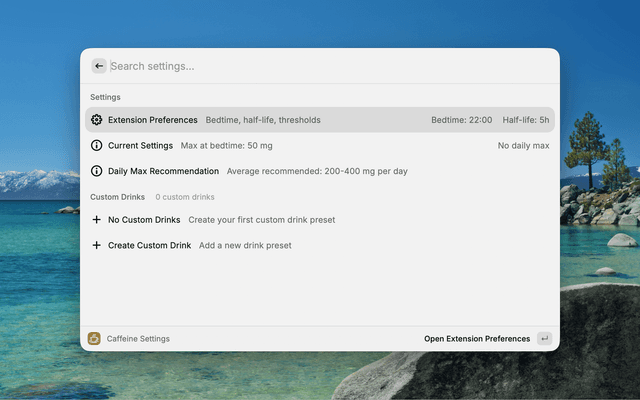 Caffeine SettingsConfigure bedtime, half-life, thresholds, and custom drinks