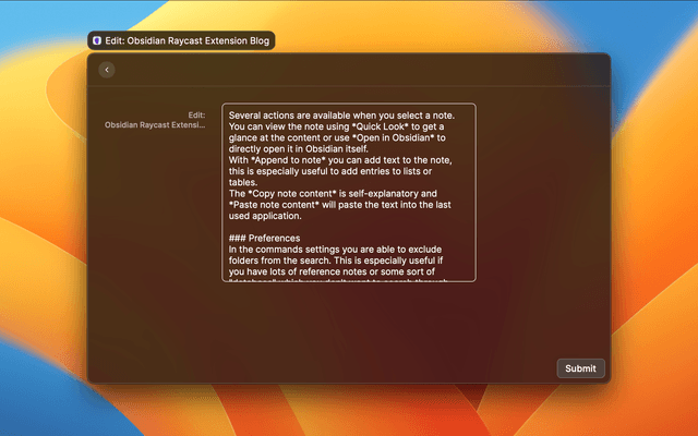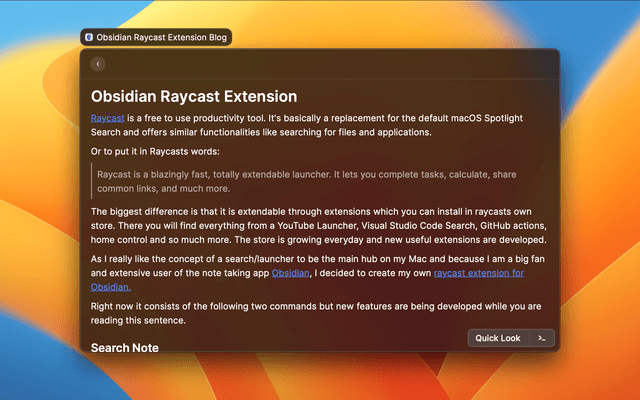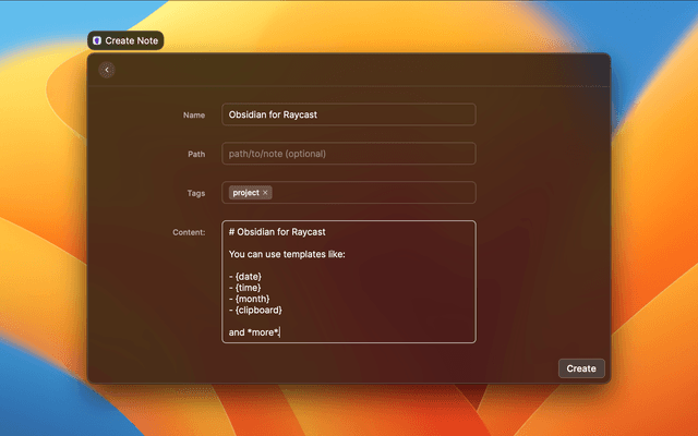 This is a raycast extension with commands for the note taking and knowledge management app Obsidian. To use it, install the extension from the Raycast Store, open Raycast Search and type one of the following commands.