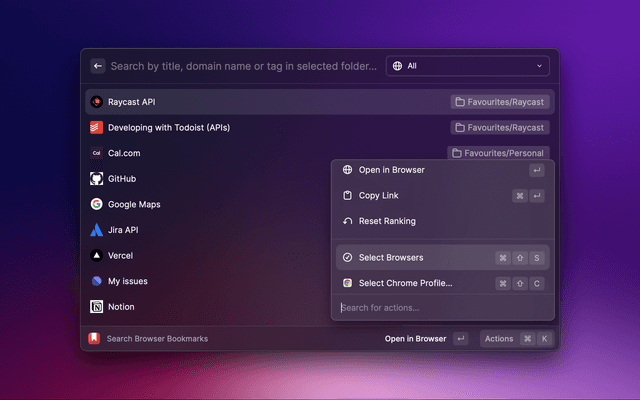 The extension retrieves bookmarks from two sources: your browsers and their profiles. The default browser is enabled by default, while the others are disabled. You can enable them using the Select Browsers action ( + + S). This will directly get your bookmarks.